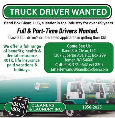 Band Box Clean/Truck in Tomah WI is looking for daytime Part Time- or Full-Time CDL drivers